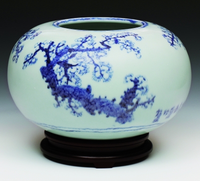 近期我主要尝试把景德镇的青花装饰用到龙泉青瓷创作上,已经做了一批作品,利用龙泉青瓷粉青釉的流动性画青花,产生像在雨雾中的朦胧感,效果很好。这在龙泉当地是从未有过的,我把它称作“青瓷青花”,青瓷釉的粉青色与青花料的蓝色结合在一起,异常的协调柔和。当然,创新是有代价的,我3年前就尝试在青瓷上画青花,全部烧坏了,但失败并没有让我止步不前,在不断摸索、适应中求生存,只要想办法、不断实践就一定能成功。