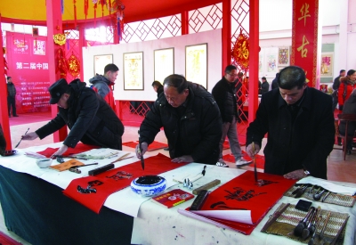 2013年12月30日, 第四届春节文化论坛暨第二届春节旅游产品博览会在台儿庄开幕。图为当地书法爱好者开幕当天现场挥毫写春联。本届论坛以“中国年·中国梦”为主题,探讨了我国城镇化进程中春节文化传承和新型春节文化的构建等问题。年博会设置了序厅、年画展示区和六大主题展区,力求办成“老百姓、采购商订购质优价廉年货的博览会”。