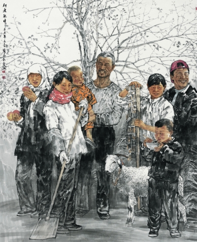 在这些尺幅不算小的画里面,是怀抱婴儿的妇女,是前往圣地的信徒,是大河寻源的探险者,是与羊儿、小狗和山地草场等相依相偎的藏民以及孩子。在一次画展上我站在兰州画院院长巫卫东的中国人物画面前,我看着里面的人物,里面的人物也在看着我,这种观看的体验,可说是一种来自对面的观看,一种相互的对视。他们亲和,离得近,我说的是其中的人性和世态之常,那种真切感和诚挚感离得近,因为,画中的他们跟我们的生存经验息息相关,尽管穿得有点不一样,吃得有点不一样,所处的地域环境和文化习俗也不大一样,但共同的朴实的情感是一样的。