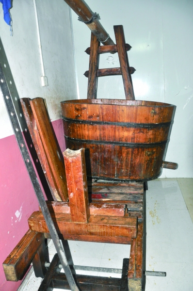 传统工艺做出来的湖之酒与众不同。刘谋彩介绍,刚完成糖化的鲜嫩湖之酒,呈乳黄色,香甜如蜜,喝起来有衡阳人最念念不忘的“粑嘴巴”的感觉。湖之酒名称起源的一个说法就是,因为原坛湖之酒太浓,喝时容易粘在胡子上,因此叫“胡子酒”。转小酒坛后,要密封发酵一个月左右,叫“满月酒”,是糖度与酒度达到均衡的最好喝的新鲜湖之酒。满月之后,湖之酒酸甜可口。湖之酒发酵成熟后,即可榨酒,分离酒糟和酒液。刘谋彩湖之酒厂目前存有一套传统大型木榨,利用杠杆原理,压榨分离湖之酒。采用这种古老的木质器具,对酒质的影响小,也是最绿色的生产设备。