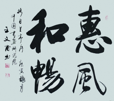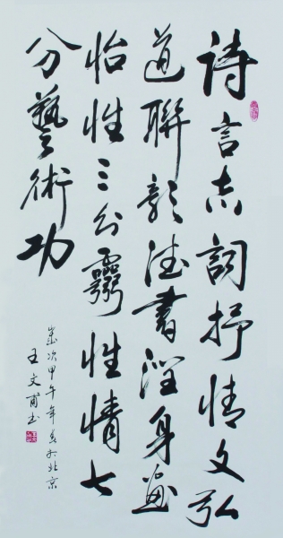 王文甫还把用笔与用墨有机地结合起来,其字利落爽劲,毫无浮怯之态,真正达到了神韵自成的艺术效果。书家对墨的浓淡干湿把握得非常精准,其笔墨干而不燥,湿而不浮,轻松但不轻飘,灵动而暗沉内力,笔轻意重,有光彩,有活力。纵观他的笔墨,其榜书大气磅礴;其行草笔走龙蛇,其小楷则字字如帖,行、草则师古不泥,融楷、行、草、魏碑、隶书为一体,刚健清新,结构严谨。不同的书体,需要不同的笔墨、不同的力度,而对这种火候的把握,完全取决于书家对艺术的感知。