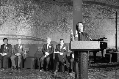 图一 开幕式在韩国济州岛Kensington Jeju Hotel大型陶瓷装置作品《生命之绽放》前举行。朱乐耕介绍了作品及其创作过程。韩国麦粒美术馆馆长洪正吉,韩国前放送局局长李敬在,韩国博物馆协会名誉会长金宗圭,中国驻韩国大使馆代表、首尔中国文化中心副主任彭尤克,中国艺术研究院副院长贾磊磊,著名画家铁杨在落成仪式上先后发言。开幕式上还播放了有关朱乐耕创作这两幅陶艺装置壁画的纪录片。