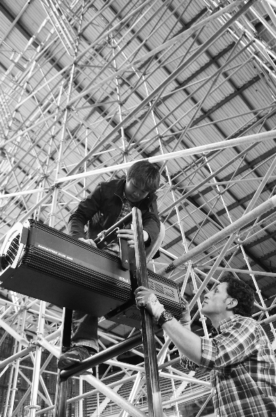 经过两天的努力,在当地工作人员的协作下,最后呈现的剧场效果简直可称为奇迹:临时调来、现场拼接的黑布遮住了剧场几十个大窗户,遍布鸟屎的台座被清理干净,舞台下方摆上了1500个白色座椅,灯光、音响一一到位,甚至连后台也贴上了引导路线的夜光胶布,扎在体育馆两天两夜的剧组人员终于松了一口气。