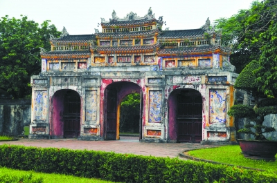 皇城是越南阮朝皇帝的宮殿,占地面积约6平方公里。皇城内有正殿太和殿,帝后嫔妃居住的紫禁城,太后太妃居住的寿祉宫和长宁宫,供奉祖先的太庙、世庙等,还有内务府、马厂和象厂等服务性机构,以及瀛洲等园林。图为4月17日拍摄的顺化古迹群的皇城一角。新华社记者 章建华 摄