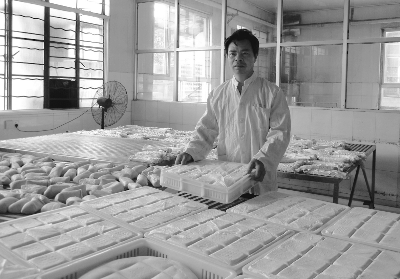 真是不看不知道,一看吓一跳,我们在阿四的百叶工厂百米之外就闻到了一股浓浓的百叶味儿,仿佛整个工业园都被阿四的百叶味儿包裹了起来,几十名职工在不停地忙碌着。上门进货的商贩以及前往零买的散户更是络绎不绝。面对阿四本人,几乎不能相信眼前这位老实巴交的农民就是贺惠清。这位看上去很厚朴的阿四,还真不简单,他自小就跟随祖父母制作后来被列为当地的非物质文化遗产保护项目手工百叶。最近又在无锡市政府、市商贸局等主管部门的指导下,在当地工商部门和社区管委会的大力支持下,走国际标准化生产的经营之路,顺应市场经济的发展潮流,从而使百叶等传统豆制品产品实现了向现代化经营的根本性转型。阿四百叶申遗成功奥秘在于与时俱进。昔日祖辈小打小闹的小手艺,在贺惠清手里实现了“老树发新枝”。