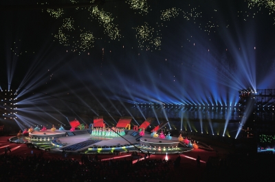 在全景式戏剧歌舞史诗剧目《花鼓春秋》中,明和的高清LED屏通过巧妙拼接,为剧目打造出一个3D的立体全景舞台。其最新的数字化多媒体集中控制技术,使整个3D立体舞台的画面连贯、富有层次感。演出现场清晰大气的LED屏画面完美再现了历代的民俗建筑、皇宫大殿等历史人文场景,引领观众走进一个变幻无穷的历史全景画卷。高科技的加入无形中大大增强了艺术作品的感染力,更大程度拉近了作品与观众的心理距离。2013年中国浏阳国际烟花节活动中,明和集团一举拿下了烟花节主舞台的舞美设计、舞台机械及视频工程。5块长方形的LED高清屏斜立在主舞台背景面,宛如一朵绽放的花朵,更巧妙的是屏面可根据演出需要升降,当绚烂的光线扑来,整个舞台宛如焰火瞬间迸发,与空中绽放的烟花竞相辉映,让观众领略到一番光影与焰火共舞的奇特美景。