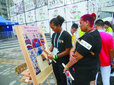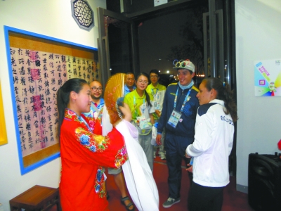 青奥村中国文化小屋内,外国运动员对中国京剧颇为着迷。