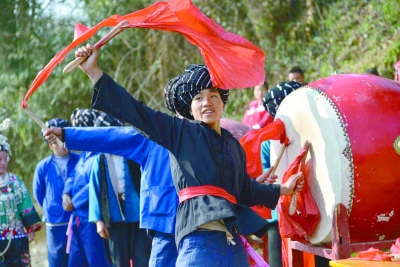 村子的最下边是清澈见底日夜喧哗的一条小河。河边,每天会有一群群的苗家姑娘结伴而来,在河边的石坝上甩布浣纱。长长布匹在她们手中飞舞,在河面上书写出浓烈诗意,然后在石坝上铺开而晒,将苗家山寨点缀得五彩缤纷,美不胜收。