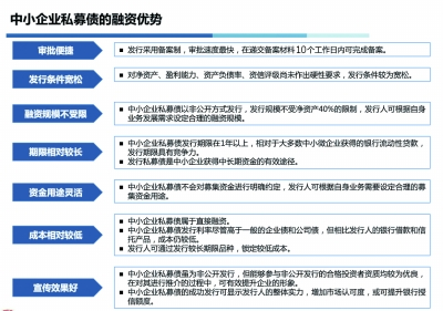 第一,发行手续简单、周期短。“12浔旅债”从开始准备发债到发行结束,仅用了20天。第二,发行门槛低。企业债、公司债等公募债券对发行主体均设有明确的净资产、净利润等方面的要求,而中小企业私募债则对发行人的财务指标、信用等级等不设明确限制。第三,发行规模不设限。由于属于非公开发行,中小企业私募债的发行规模不受“累计债券余额不得超过公司净资产的40%”或“最近3年连续盈利”“近3年平均净利润须覆盖债券一年利息”等财务指标的硬性限制,发行人可根据自身资金需求和偿债能力决定申报规模。第四,募集资金使用灵活。中小企业私募债券取得备案后,可一次性或分期发行,期限以2至3年为主,每年付息一次,到期一次还本,使用较为方便。此外,募集资金使用的自由度较高,对募集资金的用途无明确要求。第五,发行范围小、信息披露程度低。根据我国《证券法》,私募债券的发行对象是少数特定投资者,合计不得超过200人。信息披露的范围覆盖全体债券投资者即可,无需向全社会公开。第六,担保方式灵活。“12浔旅债”采用了第三方信用保证方式,在很大程度上缓解了发债企业无充足实物资产抵押的困难。