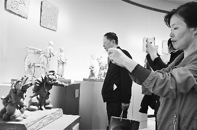 近日,由国家大剧院策划的表演艺术题材雕塑展“窑火煅情——郭宝寨、赵丛敏雕塑作品展·戏曲篇”在大剧院艺术沙龙展厅开幕,包括《茶馆》、《骆驼祥子》、《盗仙草》等经典戏曲题材在内的20余件(组)作品亮相。在此次展览中,两位艺术家用泥塑形式和别样的视角展现了中国戏曲的精髓。展览将持续至11月5日。图为观众正在欣赏作品。