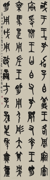 学习篆书和学习其他书体一样,找到适合自己的切入点,然后博研众体,聚古人于一堂。比如选中石鼓文为自己的切入点,在临石鼓文的同时,还可以上至两周铭文,下涉秦汉刻石乃至淸末诸家,手执心谈,求其字体形势。诸如,《墙盘》银钩蛰尾式的线条活泼而不流媚;《散氏盘》恣肆放纵的结体随势生发;《盂爵铭》不修边幅,不讲整齐,一切任性所之;《毛公鼎》沉雄绵亘的笔力贯穿始终;《虢季子白盘》疏朗至极的布白为通篇增添了流动的美感;《秦诏版》任意放纵的体势,奇趣而多姿;邓石如以石鼓而畅其致;吴昌硕以石鼓而扬其气等等,均可兼收并蓄,以使胸中宏博。学书亦如僧家托体,积千家米煮一锅粥;似群蜂采蜜,采万朵花酿一巢蜜,博采众家之精华以为己用,酝酿久之,自成一家面目。