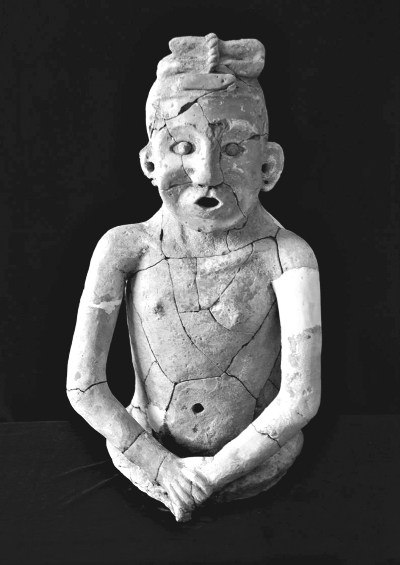 敖汉陶人的体型比较大,高55厘米左右,泥质红陶,贴塑或捏塑制成,里面中空。工艺手法采用筒形罐常用的制作方法之一——泥条盘筑。由此,我们可以猜想,当时古人在制作这座陶人时,应该有着这样的流程:先把泥料搓成长条,然后按器型的要求从下向上盘筑成型,按照设想中的雕塑外形形体变化,一圈一圈围筑,再用手或简单的工具将里外修饰抹平,使之成器。而且,我们发现,这座陶人并不是一体的,头部与身体由两部分拼接而成。胳膊与腿部实心,由类似草茎的筋状物加固,由于年代久远,草筋已不复存在,只留下管状印痕。成型后,就开始打磨陶人的外表。他们用骨器和蚌壳类工具进行磨光,最后用黑颜料描眉,画眼睛。最有意思的是陶人的头部造型,戴冠并有装饰物,发髻也是盘起来的,根据这些特征我们推测,这尊陶人的地位应比较独特,似为红山文化晚期王者的形象。
