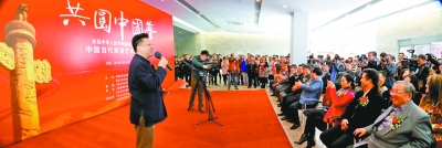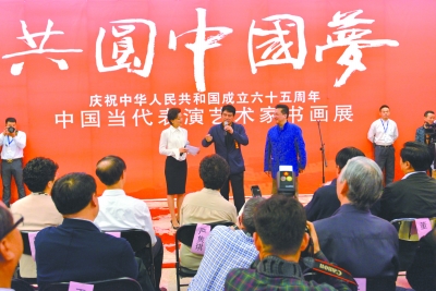 为庆祝新中国成立65周年,由中国文联主办,中国文联演艺中心策划,中国表演艺术家书画协会、北京翰林苑国际文化传播有限公司共同承办的“共圆中国梦——中国当代表演艺术家书画作品展”9月29日在中国美术馆开幕。