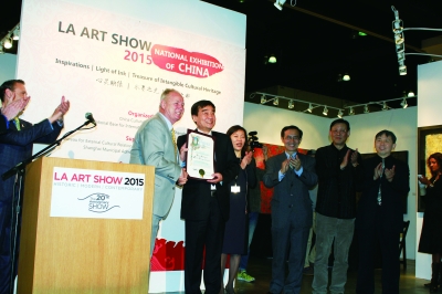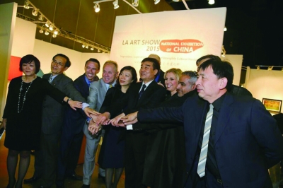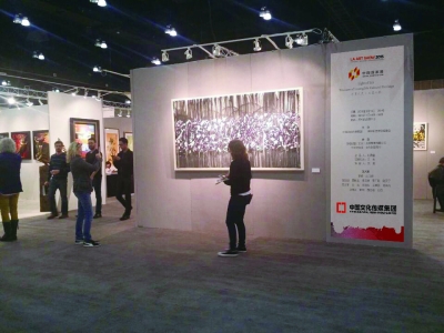 当地时间1月14日晚,2015洛杉矶艺术博览会(LA Art Show)(以下简称“洛杉矶艺博会”)在美国洛杉矶会展中心举行。由文化部支持,中国文化传媒集团和国家对外文化贸易基地(上海)联合举办的“中国国家展区”开幕式于当晚举行。作为洛杉矶艺博会上首次推出的“中国国家展区”项目,中国文化传媒集团带来的“水墨之光”和“非遗之粹”两个主题展,格外吸引藏家的关注,甚至在艺博会主场地的会展中心VIP休息区内,组委会特别甄选了水墨艺术家李纲和水墨大家庄玉君的4幅大尺寸作品布置空间,足见西方主流社会对中国艺术作品的认可和喜爱。