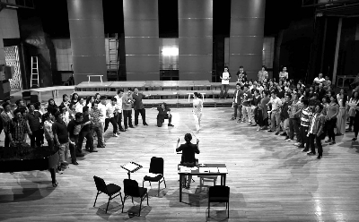 5月19日,中央歌剧院原创歌剧《北川兰辉》演职人员在剧院排练厅紧张排练。