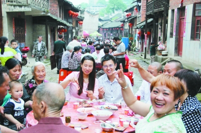 本报讯 5月16日晚,湖南永州市零陵区柳子街社区112户居民共同庆祝柳子街被评为中国首批历史文化街区,自发摆设101桌“百家宴”庆贺。来自周边地区的3000多名居民和摄影爱好者赴宴。