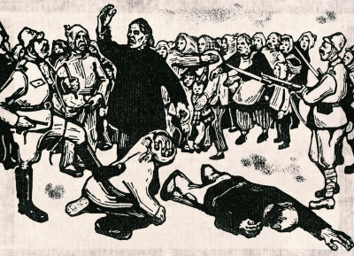 《马本斋的母亲》创作于1943年,取材于抗战时期真实的英雄事迹。抗日英雄马本斋当时率回民支队转战于冀中和冀鲁豫平原。后日军包围了马本斋的家乡,欲绑架其母亲,乡亲们为保护英雄的母亲,与敌人英勇斗争。在生死关头,马本斋的母亲大义凛然,挺身而出,壮烈牺牲。这件作品不仅在版画的民族风格上富有特色,而且以塑造典型人物、完整描述历史事件为其艺术构思的基本特点,是最早的革命历史画经典作品之一。