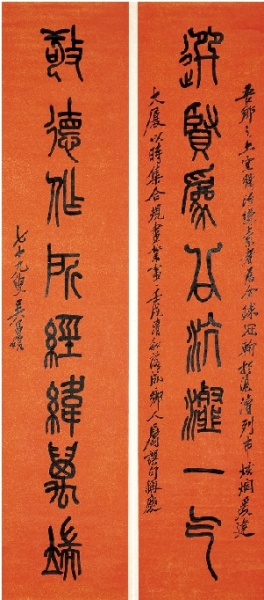吴昌硕书法大气磅礴,可谓上承先秦汉魏,笔下商周钟鼎、盘匜尊敦彝器铭文,载礼明道,涵蕴万象,最称三代丰神。吴氏年少即研磨三代吉金文字,光绪六年(1880)已逾而立,曾寓居于著名金石学家归安(今湖州)吴云两罍轩,登堂入室,承传衣钵。吴云,字平斋,晚年改号退楼,又曰愉庭,历官苏州知府。其初雅“好碑帖书画,鉴赏极精。既与嘉兴张廷济交,受其影响,笃好古器物,所藏侈富。兵燹后,南中诸家弆藏者,悉数散佚,先生居滬苏间,悬重金以求,于是阮元、张廷济以及苏州曹载奎旧藏重器亦皆归之。最著者有阮元、曹氏两家之大中齐侯罍,因名其斋曰‘两罍轩’。著有《两罍轩彝器图释》、《古铜印存》、《古官印考》、《考印漫存》、《古镜录》、《焦山志》、《虢季子白盘考》、《建安弩机考》等若干卷,尽付剞劂”。吴昌硕法书先秦文字,自是天性使然,而尤耽于石鼓文则是出于情趣风致,凡此俱得道于吴云指授。故能临写案头,思寐枕席,揣摩研读,所好平生而至老未已!石鼓文书体修颀舒徐,神韵灵动,须悬腕从容为之。而吴昌硕以书入画,以画行书,故能自成佳妙。再观吴氏行书,兼得碑版法帖,而于黄庭坚与王铎、包世臣之神韵浸习尤深也。