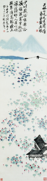 在前本《山中春雨》图中,齐白石在画中连画三大块面积、墨色浓度相似的云山和树丛。用如此浓重的水墨和豪放的用笔画米点山水当然也是齐的创造,但三大块浓重的墨团在画中显得有些拥塞,尤其是中间右边一块云山在画面中更显蛇足之弊。故在后本之《雨后云山》图中,同样为雨中云山,但米点的远山已缩小了面积,下面的树丛不仅减少了墨色的浓度,增加了墨色的层次,且缩小了树丛的大小。前本中部的云山被取消,变成较为通透疏淡的河面和有些屋舍的坡岸。整个画面当然变得空灵雅致起来。