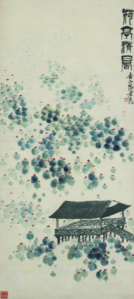 在前本的《板塘荷香》中,画面下部是一片荷塘中呈丁字安排的两座塘上小屋,中部是一塘荷花,荷叶片片,而画面上部荷塘之上还有板桥和远山。而后本的《荷塘清暑》图,齐白石只画有一座塘上小屋。空旷的小屋内桌子茶杯俱在,启人遐思。中部的荷塘占了全都画面,远处的板桥远山则全部取消。画面简洁单纯,诗意盎然。再仔细比对,前本之荷,片片荷叶大同小异,浓淡变化也不大,显得板滞一些。而后本荷叶则随意点定,浓浓淡淡,自然而然。两画相较,齐白石的修改思路和改后效果也就可以一目了然了。
