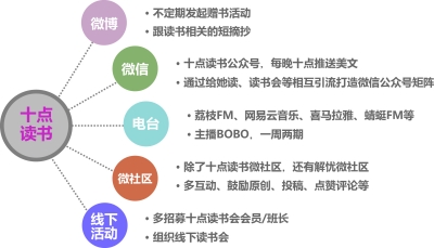 根据公开的数据显示,“十点读书”公众号受到众多文艺青年的热捧,位列全国读书类公众号第一位。今年7月在新的月排行榜中,“十点读书”排在500强的第4位,位列人民日报、央视新闻和FM93交通之声之后。今天的“十点读书”已远不止一个微信公众号那么简单,除了同名微信公众号和微博之外,还包括35万粉丝的“她读”、35万粉丝的“十点电影”、30万粉丝的“十点电台”、分公司运营的“小柚子童书”、入股的“疯狂鸟窝”和“大块旅行西藏”覆盖数百个微信群和20个城市的“十点读书会”“十点读书新媒体”矩阵,“十点读书”已建立起一个从读书到女性阅读、电影、动漫、童书、旅行等多纬度,从文字到语音,从线上到线下的新媒体矩阵,这里面,不乏电台和社群等可能成为下一个热点的领域。