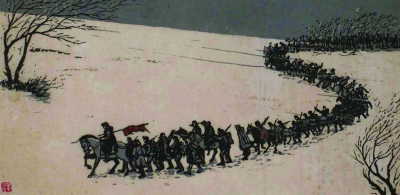 《挺进敌后》是刘铁华在1941年创作的版画,刻画了抗日战士们在山坡上雪地行军的场景。虽然画幅不大,但人物刻画写意传神,每个人物的动态都有所不同,或扛旗、或背枪、或骑马、或步行、或前行,或回首……洋溢着抗战将士们昂扬的斗志和乐观精神。尤其利用队伍从右上向左下方蜿蜒前行展开构图,气势浩大,显示出一种必胜的信心。