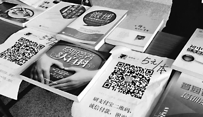 与往期不同的是,本次书市的大部分摊位前没有“卖家”,而是设置了支付宝二维码,上面标注了图书价格。读者选到喜爱的图书后,用手机扫一扫二维码即可完成支付。这一方式既方便了买卖双方,又在读者间传递了诚信的力量。