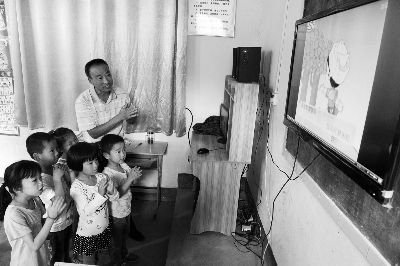 从2011年起,位于大别山腹地的安徽省金寨县陆续开始给全县范围内的学生教室安装网络化教学设备,通过互联网让山区孩子们享受到高质量的教育。如今,网络化教学设备的安装已覆盖该县近九成学校,剩余学校也将在未来陆续安装。图为9月8日,金寨县秦湾单班教学点老师陈业顺带领学生在网络化教学屏幕前学习儿歌舞蹈。