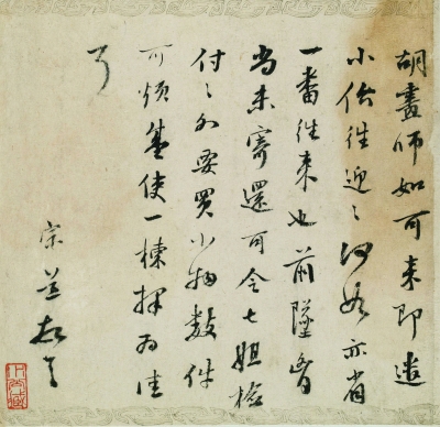 再回来看看书画家的尺牍,里头也有非常生动的文人生活场景。文彭写给上池的信,内容关于篆刻创作,从信文可知上池的身份除了负责文彭篆刻的应酬交易,本身也是一位医生。又,关于润笔之事,自古有之,然文人都不便明讲。从董其昌的信上,我们知道先前收信人寄去稿件,请董其昌作序,董说作序乃举手之劳,不必酬金,只要求文征明之画为润笔之资。我们在展阅尺牍之际,似乎也见到董其昌快言快语的自信豪情。