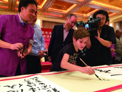 本报讯(记者梁毅)9月13日,由中国外文出版发行事业局支持,人民画报社、中国中央电视台网络台、驻华使节&夫人才艺大赛组委会、中国歌剧舞剧院主办的“友谊之声——中国书法音乐会暨外国驻华使节与书法家联谊会”在北京钓鱼台国宾馆举行。十届全国人大常委会副委员长顾秀莲,十一届全国政协副主席郑万通,全国政协教科文卫体委员会副主任胡振民,中国外文局局长周明伟,中国文联党组副书记李屹,中国书协副主席、人民画报书画院院长苏士澍,人民画报社社长于涛,来自近100个国家的150位驻华使节及夫人,以及来自内地、港澳台的150位知名书法家出席了此次活动。