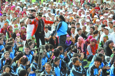 “我们从北京来的,这是北京的艺术家编的平安结,希望你们好好学习,将来到北京上学。”8月21日,在帕米尔高原下的乌鲁克恰提边防派出所,陈启刚给在场的柯尔克孜族小朋友戴上了寓意平安的手串。为了能让周边百姓也欣赏到来自北京的演出,战士们特地邀请了周边村民一起看节目。这天,他们中很多人穿上了只有在盛大节日才穿的新衣服,有的老人则抱着民族乐器库木子来到现场,希望跟演员们一块联欢。被现场的气氛感染,没有演出任务的口技演员冀勇主动走到他们身边,模仿起了小动物的叫声;虽然并不具备演出条件,中国杂技团的演员仍旧克服困难,完美展示了曾经获得蒙特卡洛国际马戏艺术节金小丑奖的杂技《四人技巧》。