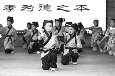 9月24日,北京市委农工委等单位在延庆县大庄科乡慈母川村共同推出“美丽乡村 筑梦有我”主题活动,通过北京市文化试点村建设,携手“美丽乡村”文化志愿者,进一步创新乡贤文化,给乡村提供群众喜闻乐见的文化服务。图为小学生在活动现场朗诵《弟子规》。本报记者 陈 曦 摄