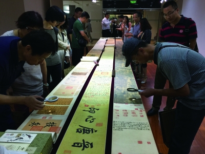 故宫博物院“石渠宝笈特展”真迹展出之际,由荣宝斋主办,九州兴和文化发展(北京)有限公司、荣宝斋各地分店共同承办的“故宫九十周年‘石渠宝笈’荣宝斋高仿真艺术品全国特展”,9月22日在荣宝斋北京店和全国各分店亮相。据介绍,这批艺术品包括《清明上河图》、《三希堂》(《快雪时晴帖》)、《中秋帖》、《伯远帖》、《兰亭序》,由故宫博物院正式授权、监制,加盖故宫钢印,由曾经复制《富春山居图》的荣宝斋专业团队再次制作,全卷1:1高仿真复制。图为观众使用放大镜仔细品鉴作品。