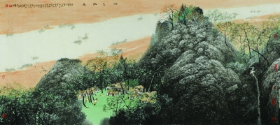 他的创作包容性强,作品很多地方既妙合前人,又有自家面目。尤其在色彩方面,他很有心得。他在传统浅绛、重彩的基础上,融入西方的色彩构成元素,冷暖协调,厚而不腻,淡而不薄,鲜活明艳中不乏温润朴厚的气息。有的作品用色极少,如黑山白水间只有高士一袭红袍;有的用色浓烈,如《得鱼图》、《后山月色雨濛濛》等,鲜红的屋顶占据大部分画面。可无论用色的多与少,他都能恰如其分,充满了诗一般的抒情意味与节奏感。