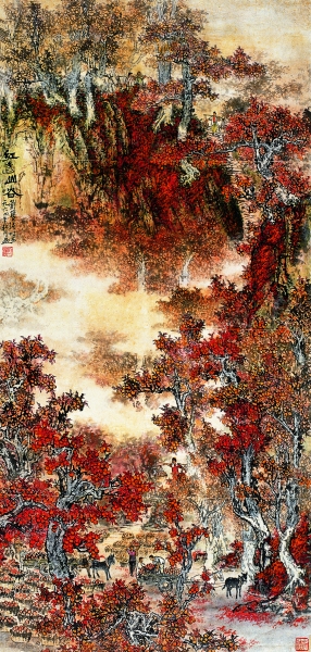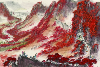 刘宝纯是20世纪50年代以来,中国新山水画一派延续发展的重要代表人物。展览展出了刘宝纯半个多世纪以来创作的诗书画作品百余幅,一丈八尺(600×248厘米)的巨幅国画达8幅之多。其中,有60幅上世纪六七十年代作品,如1964年的《红透山谷》,1971年的《黄河写生》,1972年的《海河四女寺工地》,1976年的《长江写生》等,无不是以坚持“二为”方向、“双百”方针,以“歌颂祖国、美化生活”为前提,深入多彩生活,描绘山河巨变,塑造时代风貌的精品力作,曾经在全国画坛产生过很大影响。从20世纪五六十年代开始,李可染、傅抱石、石鲁等人,通过写生积极地推动了中国画的现代性转变,形成了表现祖国山河新貌、具有鲜明时代精神的新山水画。作为1964年全国美展的优秀作品,刘宝纯的《红透山谷》完全打破了传统山水画的笔墨程式,画面以中景构图突出了山谷之中层林尽染,丹柿飘香的丰收景象,改变了传统山水画水墨为上的审美准则,而是以大面积的朱砂点染柿林,渲染意境;穿插林间的果农为画面增添了浓郁的生活气息,作品的成功,在于通过画面健康明朗的意境,真实揭示了新的社会制度给人们带来的新的精神风貌。