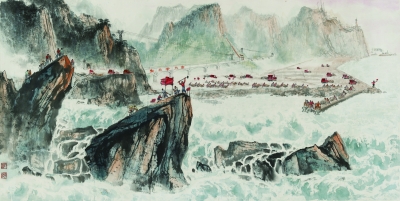 刘宝纯认为,“学习传统,旨在发展;深入生活,旨在提高。”从上世纪60年代起,他游历大江南北,多次登泰岱、临沧海、逆九曲黄河而上,沿万里长江而下;又遍游齐鲁、三秦和巴蜀等地的名山大川,开拓胸襟,陶冶性情,积累素材,双脚踏遍祖国的山山水水,在造化自然宗师泰山、黄河、大海间孕育浩瀚之气,积蕴蓬勃之机。“深入生活”,是刘宝纯一以贯之的创作宗旨。本次展览展出的《穿山引水》、《塘沽船闸》、《展宽河道》、《开赴新工地》、《海河之春》、《塘沽新港》等“三河”组画即是他身体力行“深入生活”画真山水的重要成果。