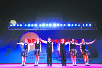 9月26日,由北京市东城区文化委员会、东城区城市建设管理委员会联合主办的“2015中秋钟鼓楼诗会”在北京钟鼓楼文化广场举行。东城区文化志愿者、著名表演艺术家、社区群众等同台诵读古典名篇和新人佳作。100名外来务工人员代表以及街道社区的群众代表等观看了当天的诗会演出。图为东城区史家小学的学生们在朗诵《春江花月夜》。本报记者 王学思/文 卢 旭/摄