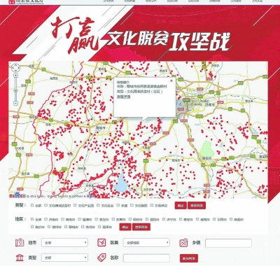 文化精准扶贫地图什么样?打开后可以查询贫困村的地理位置,同时村子周边的文化资源一目了然,贫困村当前的文化基础条件和扶贫情况也一一在列。山东省文化厅官网上的文化精准扶贫地图是山东开展文化扶贫的一个标志。山东省文化厅负责人介绍,地图上的一个个小红点,预示着文化扶贫需要踏踏实实、一步一个脚印地往前走,不能让一个村掉队。