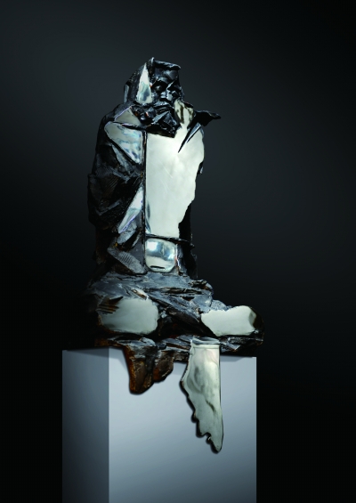 历史上,为达摩画像、造像者不计其数,多以想象绘制其肖像。景育民没有遵循这条路子,而是将“面壁修炼”的故事意象化为一尊“写意雕塑”,以其传达出达摩结跏趺坐持之以恒静心修炼的精神。其头部与面部以有如山石般剧烈起伏的块面刻成,身体部分则完全脱离解剖结构,以水墨写意中大斧劈皴法般的手法将其“石化”为与崖壁一体的精神实体。最特别的处理无疑是几块镜面般的平面,一方面是壁面的象征,另一方面具有映照俗世现实的功能。以红尘滚滚、光怪陆离与终日默然面壁冥想形成对比,作为精神偶像的达摩已经成了一种理念,这就是景先生立此象之“意”。在此,有个很有意思的事实需要提及,达摩创始禅宗是不立文字的,所谓“直指人心,见性成佛,不立文字,教外别传。”缘何?是否与《易传》中“言不尽意”从而“立象以尽意”一脉相承《达摩·面壁》似乎为这种精神联系提供了绝佳的视觉象征。