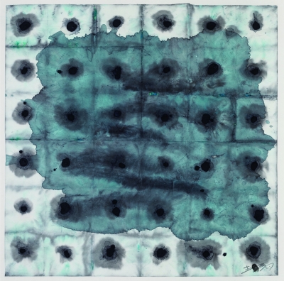 我们也可以从中国文字的角度来讨论这种矛盾并置的潜力。李纲作品中的基本元素是点、破墨、晕染……这些中国画的基本语汇,并无特别之处,只是在不断的差别中显精神。与此同时,他的“结构”是一成不变的——它是一种极为单纯、历史恒久的原型叙事:圆与方的变奏。就如同写经一样,相应于整体的无意义(经文并不是典型的叙事文体无所谓先后),个体表达是各呈其彩的。相比于突出主体“造型”的做法,这种无始无终、无厚无薄的铺陈创造出一种介于“具象”和“装饰”之间的二维空间——如果丢掉了“画框”和“秩序感”这两根拐杖,也许这样的“二维”也仅仅是平面。