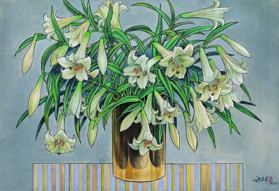 祝大年对待艺术是真诚而纯粹的,从他几十年如一日热爱工笔重彩与表现植物题材来看,他在艺术上也是专一的。祝大年曾坦言自己在绘画中偏爱工笔重彩画,他认为工笔重彩画色彩绚丽、描绘精致,表现力极强,且有着深厚的装饰传统,是我们祖先留下来的极为宝贵的文化遗产,并且能给他带来乐趣。而在题材上,自然中的风景、植物始终是他百画不厌的主题。祝大年热爱生活,将触目所及的风景、植物与他所理解的生命状态联系起来,并赋予人类的情感和情绪,因而他笔下的植物都如此鲜活而富有情趣。