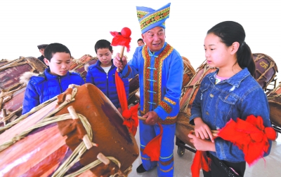 图为2月17日,韦建廷(右二)在广西马山县壮族会鼓传承基地教孩子们打鼓。