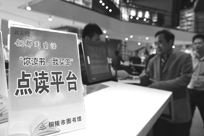 铜陵市图书馆于2016年4月与铜陵市新华书店合作推出了“你读书,我买单”活动,全力打造线上线下相结合的阅读“点读”平台。该平台通过互联网,实现图书馆、读者和书店的书目信息与读者数据共享,读者在书店看到喜欢的书,可以通过设在书店的“点读”平台办理相关免费借阅手续,看完后将书还到图书馆即可,图书馆将根据“点读”平台的借阅数据,定期与书店结算。