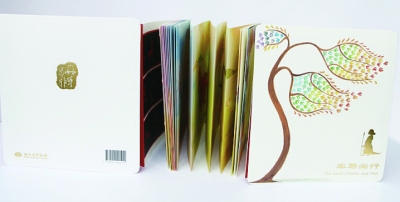 《车马出行图》绘本画册历经15个月,由青年画家以纸本水彩的方式对画面进行了再创作。绘本画册运用线勾平涂手法,使众多人物组成了一幅色彩富丽、生动活泼、富有立体感的图画。整幅图画中最引人注目的就是用五棵柳树,将画面巧妙地分隔成五个画段,强化了故事情节。全部白描图印在背面,构成类似手风琴的拉页结构,打开后即可以了解文物信息,看到文物本身高清大图,又可以看到画家的创作,还可以自己动笔,将这幅2000多年前的画赋予自己的想象、色彩和意义。