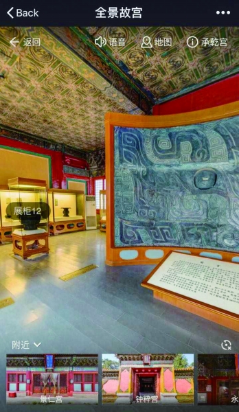 2017年2月17日,新版“全景故宫”上线。新版“全景故宫”对故宫14座宫殿进行了细致入微的展示,如文华殿陶瓷馆、武英殿书画馆、承乾宫青铜器馆,“欧斋墨缘——故宫藏萧山朱氏碑帖特展”“故宫博物院藏清代碧玉器与玛纳斯展”等,用户可以通过手机近距离反复赏鉴,而不用像以前一样扎堆观展、走马观花。此外,体验者还可以通过语音和文字获取每一座宫殿的信息。微景天下对漫游场景的选择与视角进行了重新调整,更具视觉冲击力;还上线了地图及定位功能,让用户能看、能听、能导航。