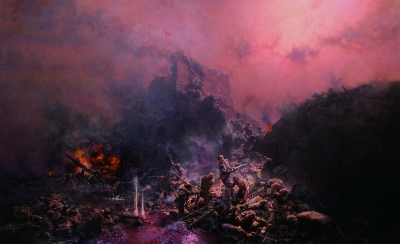 基于对历史的了解,我慢慢地将胜利高昂的明快色调,改成深沉混沌的色调,低暗的天空硝烟弥漫,衬托出前景中雕塑般的人物。画面创作到2009年四、五月份时才慢慢接近我内心的效果,好像越到后期越知道该怎么画了。创作这张作品使我收获很大,不仅得到了一些大场面人物组合绘画的经验,而且在这三年中,无数次与先烈们在画布上对话,无数次被他们的精神所感动。因此,《血战台儿庄》这张油画,也是我从小的英雄主义情结和国家重大历史题材美术创作工程碰撞的结果。