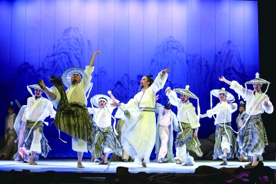 该剧舞蹈的观赏性很强,群舞《踏歌》《酒香舞》等令人印象深刻。《踏歌》改变了以往常见的女性群舞,以一群樵夫为主角,是阳刚的男子群舞。这一大胆尝试拓展了中国传统舞蹈的发展空间。《酒香舞》中,令人赏心悦目的除了女舞者的婀娜舞姿,更有长时间在空中飘舞的“手绢”,仿佛把浓浓的酒香气凝固在空中。原来,这“手绢”不是普通布料材质,而是一种轻薄的塑料纸,被扔向空中后不会落下。道具的巧妙选材与舞蹈完美融合,创造了非凡的视觉效果。