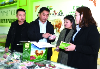 图为吴云波(左二)在内蒙古自治区扎鲁特旗鲁北镇的销售店向顾客介绍合作社的牛肉产品。新华社记者 任军川 摄