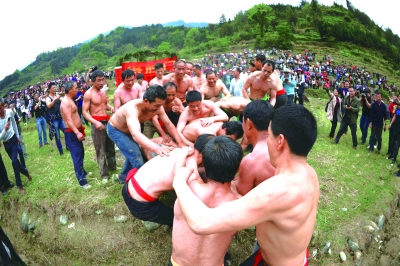“抢花炮”是花炮节的重要项目,是我国苗族、瑶族、侗族具有浓郁民族特色的传统体育竞技项目,被誉为“东方的橄榄球”,并被列入全国少数民族传统体育运动会比赛项目。图为花炮节当天,赤膊上阵的花炮运动员在激烈竞技。