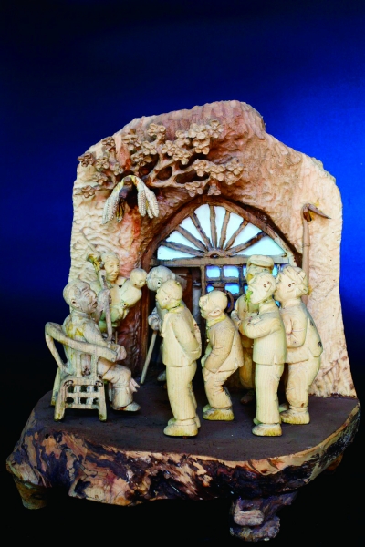 说起木雕作品的诞生过程,梁俊维一反平时的少言寡语,话语滔滔不绝。他介绍,一件木雕作品的成形,要经过构思、选料、出坯、修细、打磨、上光、组装7道工序,而最难的则是作品创意。《盲人夜书》这件作品的意境就是他亲身经历的生活场景:“盲人说书现在几乎没有了,这个拉胡弦说书的盲人,我小时候还听过他说书。”梁俊维说,以前的农家院子里经常有这样的场景,街坊四邻晚上闲来无事便聚在一起听书闲聊,他就是将当时的场景通过木雕“复原”出来。